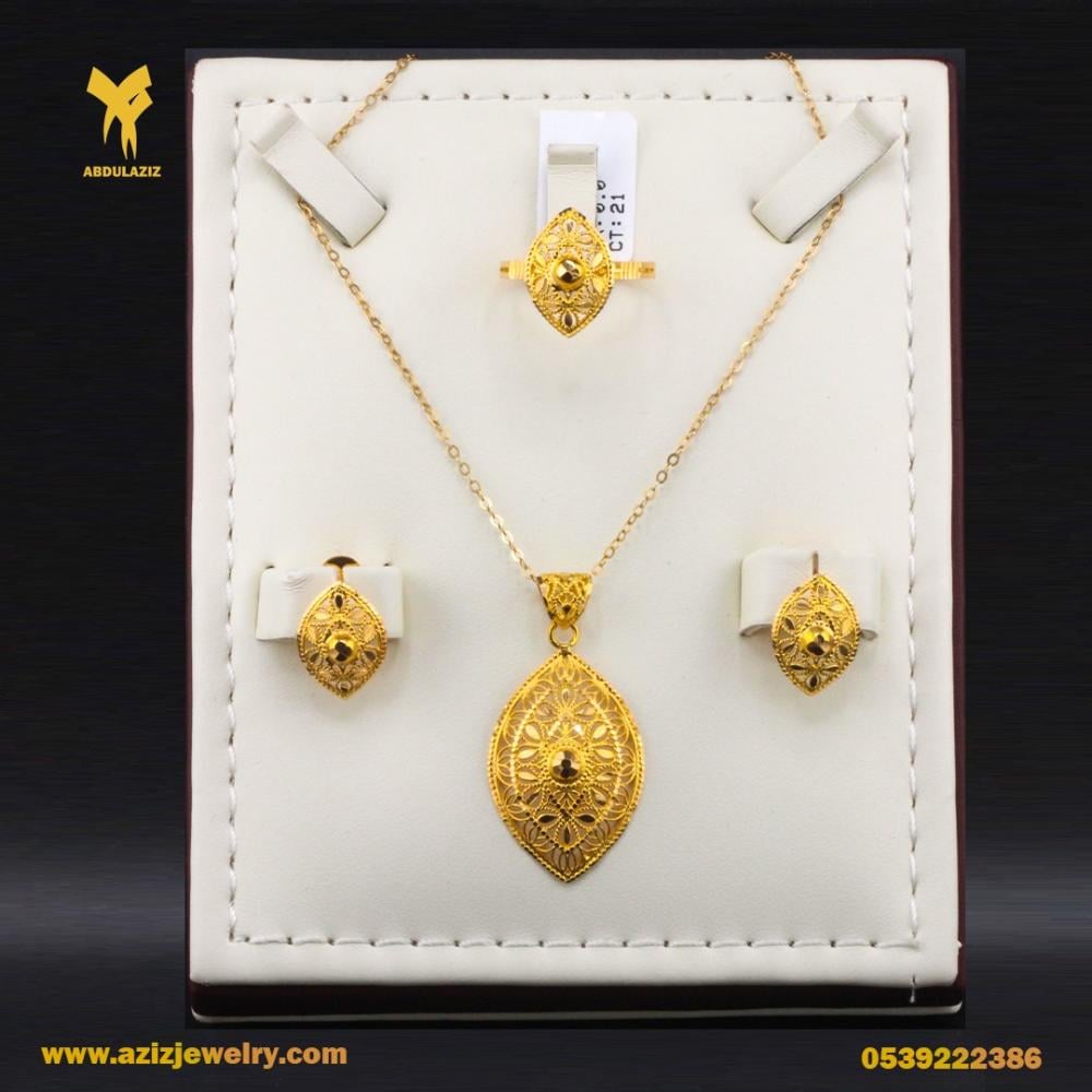 نصف طقم ذهب أصفر عيار 21 بتصميم أنيق يجمع بين الفخامة والتفاصيل الدقيقة. يتكون الطقم من عقد متألق، ، وخاتم ساحر، وحلق بديع. هذه المجموعة المتناغمة ، لتضيف لمسة من السحر والأناقة الفريدة على إطلالتك.